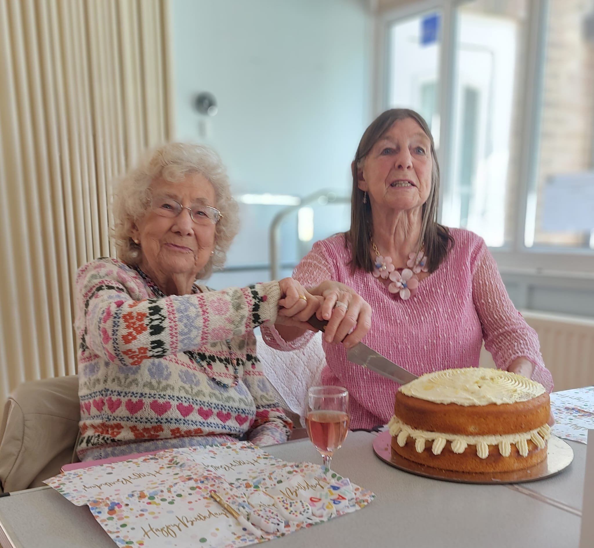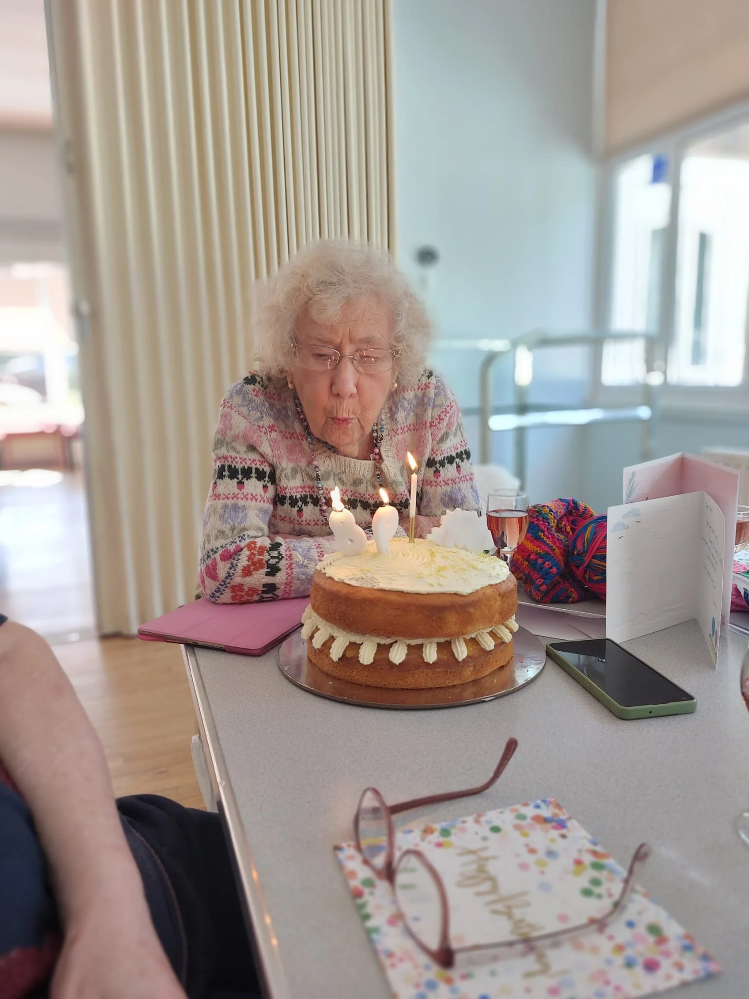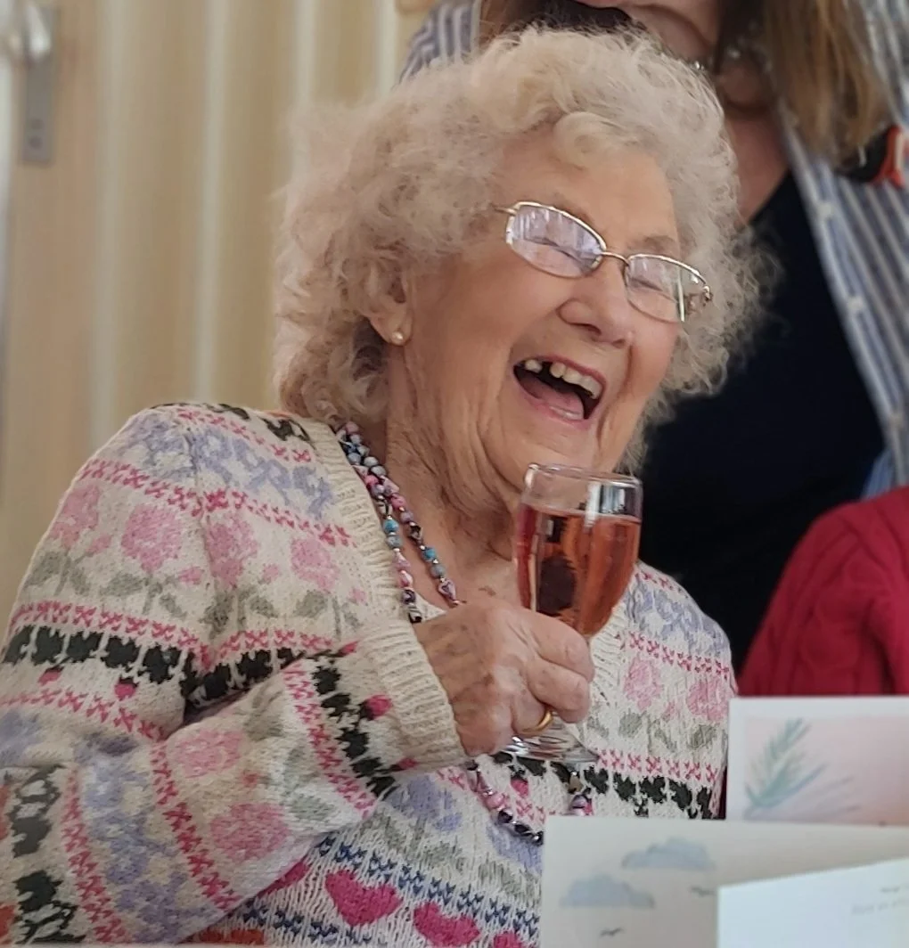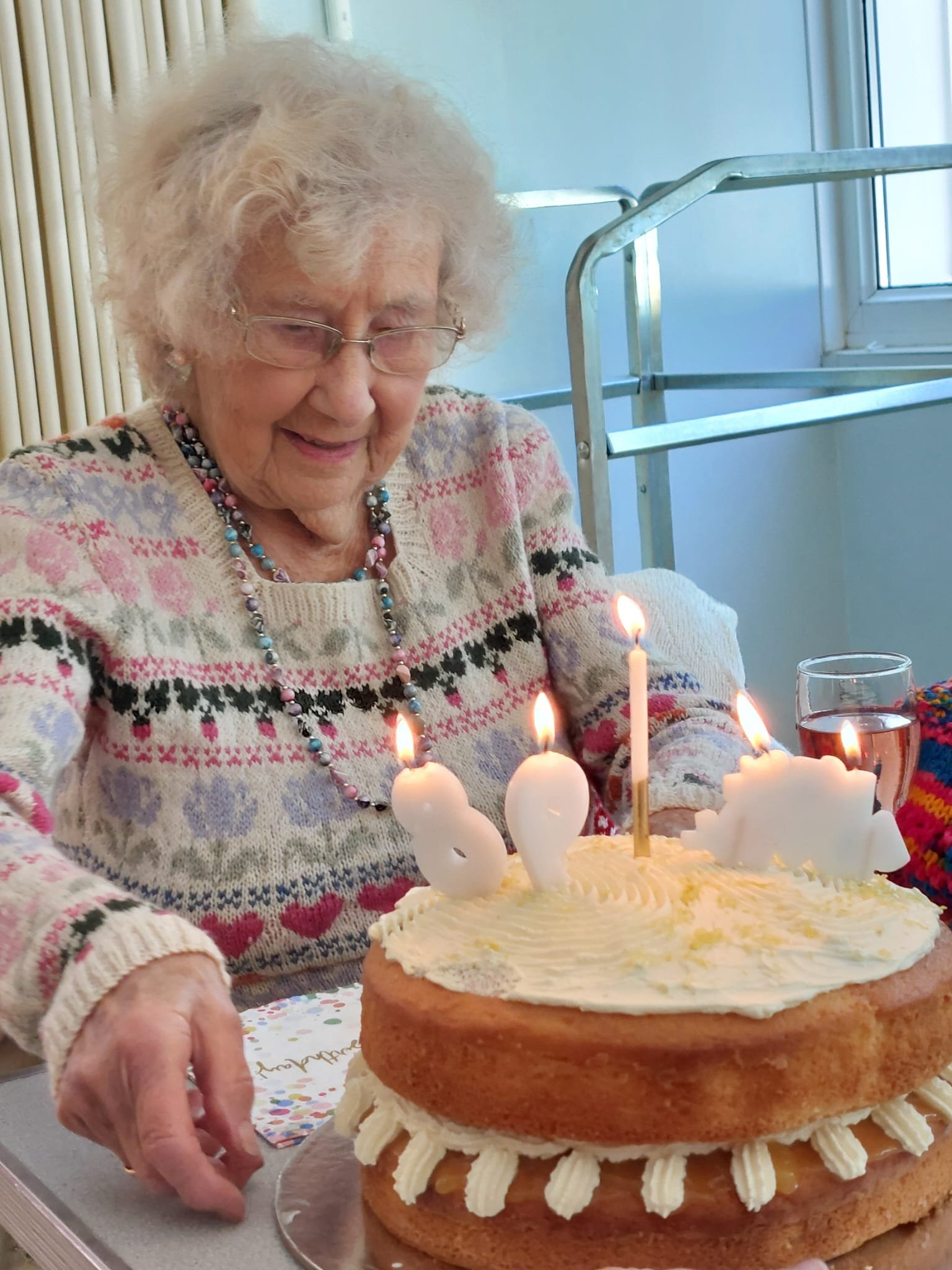 Beryl still loves traveling , she took a holiday in Spain last autumn , enjoys her garden and her knitting….check out the jumper she is wearing which is one of her makes!